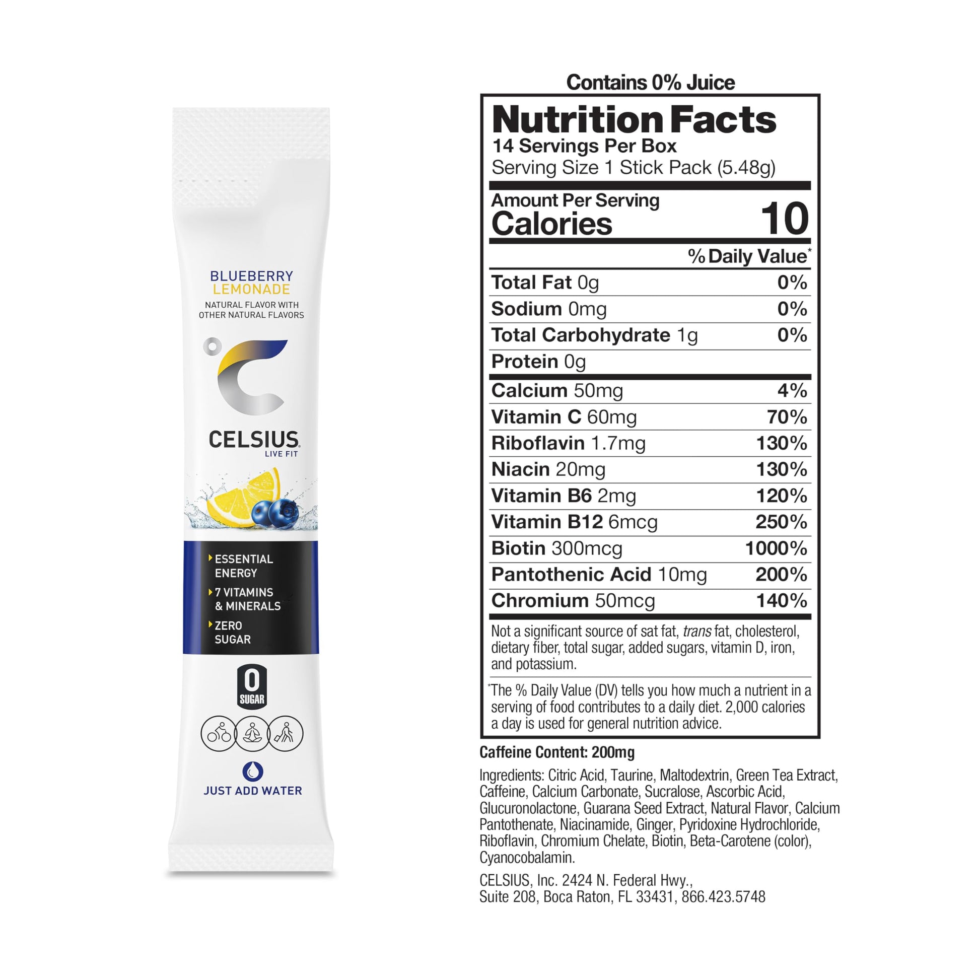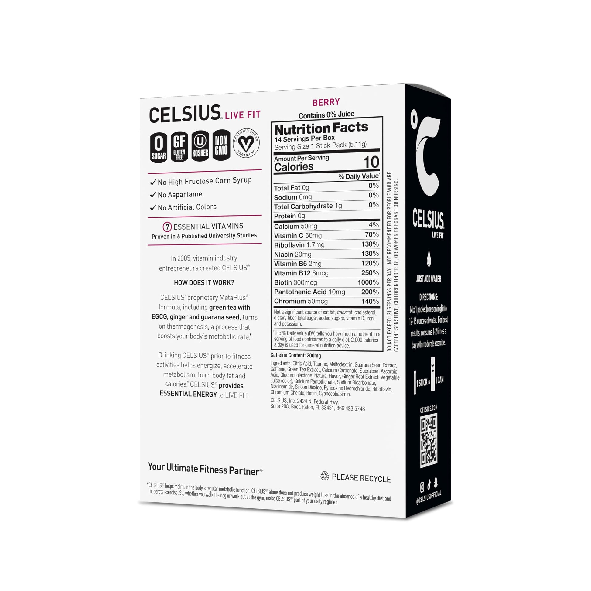 CELSIUS® is functional, Essential Energy– a better-for-you, premium alternative to traditional energy drinks, made with 7 essential vitamins and zero sugar. As a global, lifestyle fitness drink, CELSIUS was created to help people LIVE FIT, exceed their goals and elevate their everyday lives. Our CELSIUS On-the-Go Powder Sticks contain the same clinically proven ingredients as CELSIUS, only its compact, convenient and perfect for traveling. Whether you’re hiking trails, beachside chillin’ or ski lodge loungin’, CELSIUS On-the-Go Powder Sticks are ready when you are, so you can be ready for anything. Our proprietary MetaPlus® blend contains green tea extract and EGCG. It also includes guarana seed extract, ginger root for flavor and digestion, vitamin C to support your immune system, vitamin B for energy production, and chromium to help control hunger, making it an ideal pre-workout drink. CELSIUS On-the-Go Powder Sticks allow you to adjust the powder you use depending on the level of energy boost you require, making it a flexible option. Our powders can be mixed with various liquids, such as water, juice, smoothies and protein shakes, allowing you to personalize the taste and consistency to your liking. You can never go wrong with the simple, fruit forward flavor of orange, and CELSIUS® Orange On-the-Go Powder Sticks deliver the citrus energy boost when you need it most. Enjoy CELSIUS® On-the-Go Powder Sticks anytime, anywhere. Just add water and go! Add one powder stick packet to 12-16 oz. of water and you have Essential Energy on the go. CELSIUS® On-the-Go Powder Sticks have the perfect balance of flavor and energy that serve as an awesome pick-me-up for active lifestyles. One powder stick is equal to one CELSIUS ready-to-drink can, and each box comes with 14 powder stick packets. Make CELSIUS® Essential Energy your go to pick-me-up– anytime, any place!