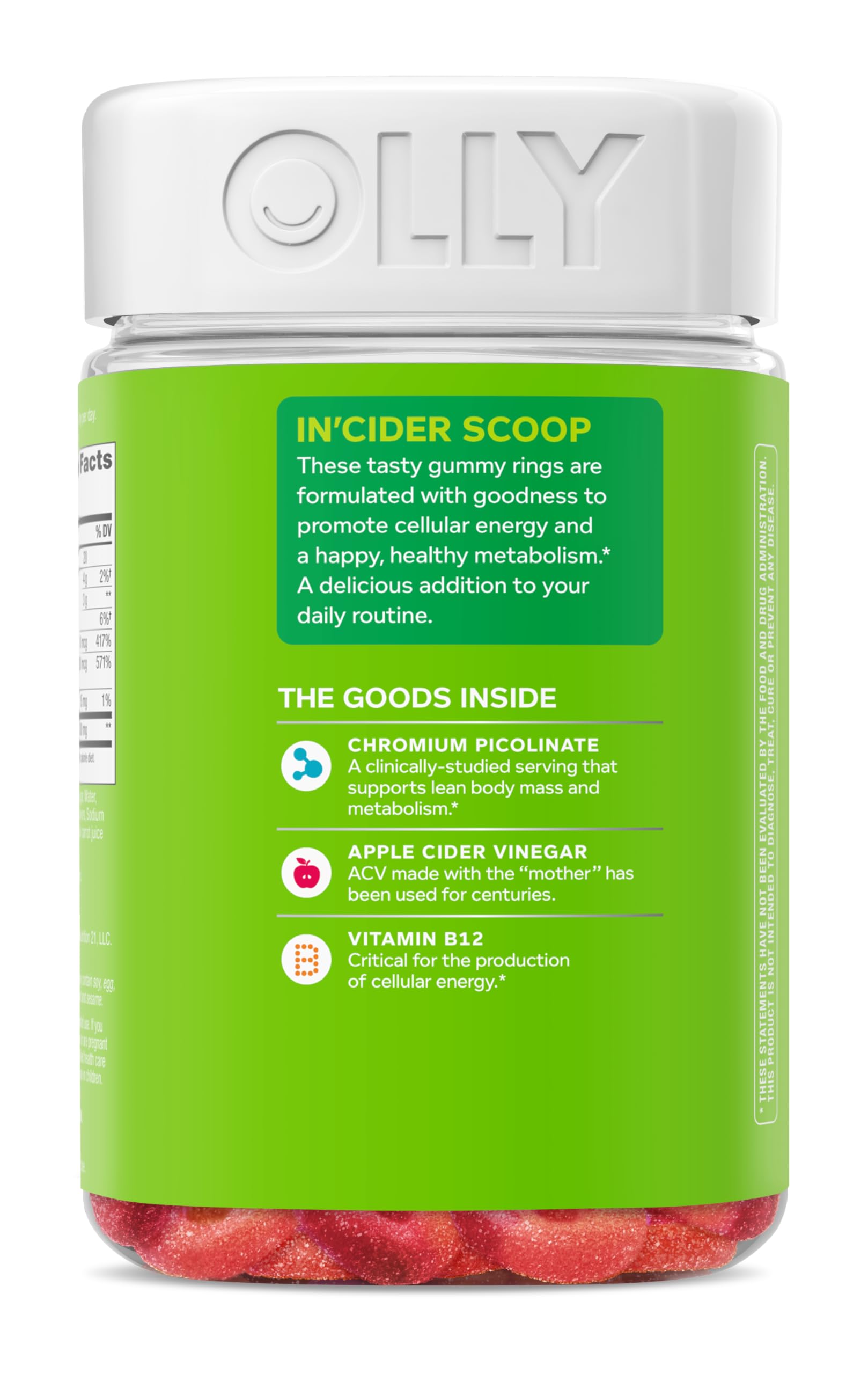 OLLY Metabolsim Gummy rings are formulated with goodness to promote cellular energy and a happy, healthy metabolism.* They’re expertly blended with Chromium Picolinate, a clinically-studied amount that supports lean body mass‡ and helps boost metabolism, Vitamin B12 for cellular energy production and Apple Cider Vinegar with the Mother. The gummy rings come in a super delicious Snappy Apple flavor with other natural flavors, so you get Apple Cider Vinegar without having to drink it. No synthetic flavors or colors, and they’re gluten-free. Adults, take 1 gummy per day. Chew thoroughly before swallowing.* At OLLY, good health is at the center of everything we do. We create delightful vitamins and supplements with real-deal benefits that help you live Happy Inside Out. ‡With a healthy lifestyle, including exercise. *These statements have not been evaluated by the Food and Drug Administration. This product is not intended to diagnose, treat, cure or prevent any disease.